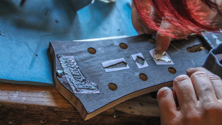 Entsprechend der Kundenwünsche sind unsere Instrumente mit kunstvollen Einlagen verziert. Diese sind zumeist aus echtem Perlmutt und/oder verschiedenen Metallen und werden von Friederike Preuß in Handarbeit hergestellt, eingelegt und graviert. Jedes Originalinstrument von Preuß Guitars ist erkennbar am Firmenlogo aus massivem Perlmutt. Optional kann man sich sein individuelles Inlay auf sein Wunschinstrument einlegen lassen. Hierzu genügt meistens eine Skizze oder Foto als PDF oder JPG.